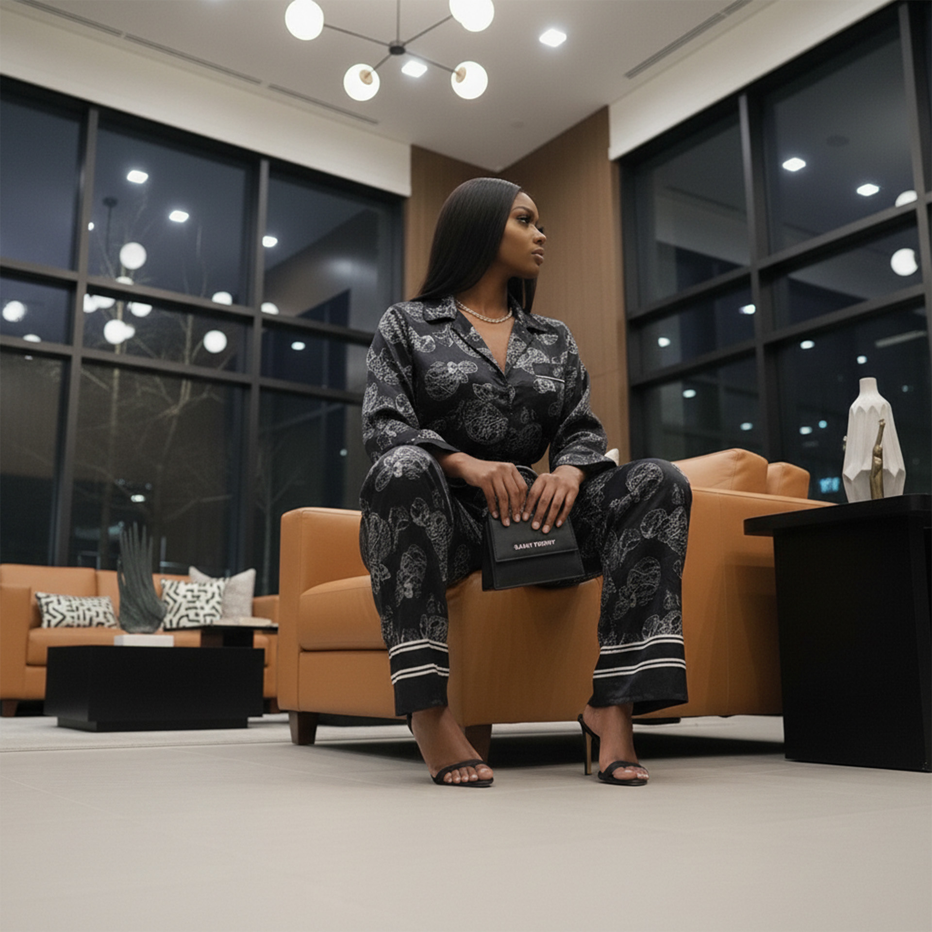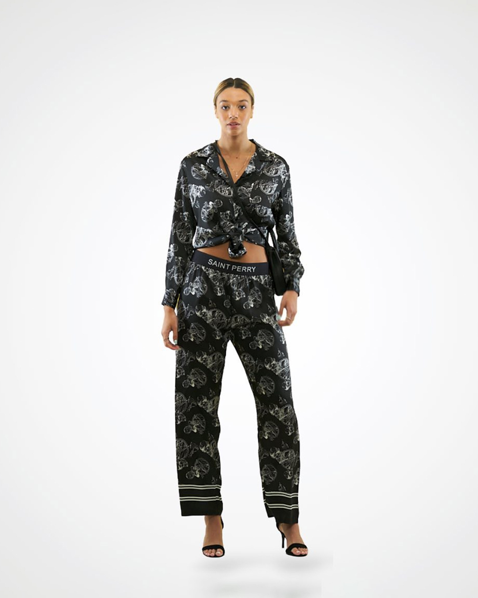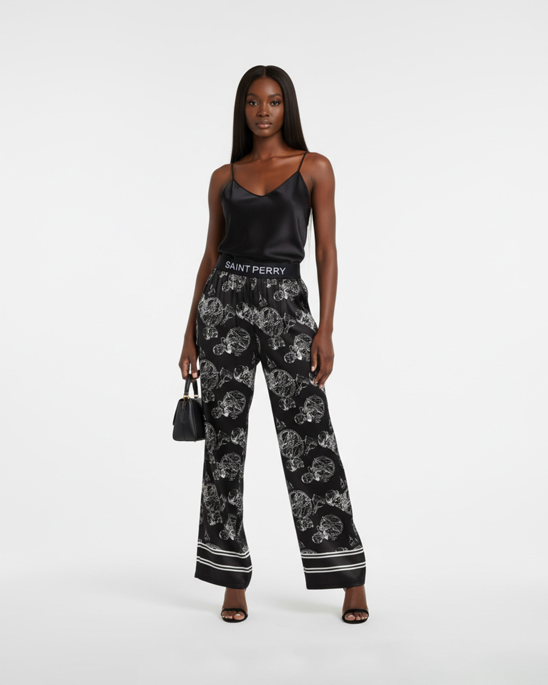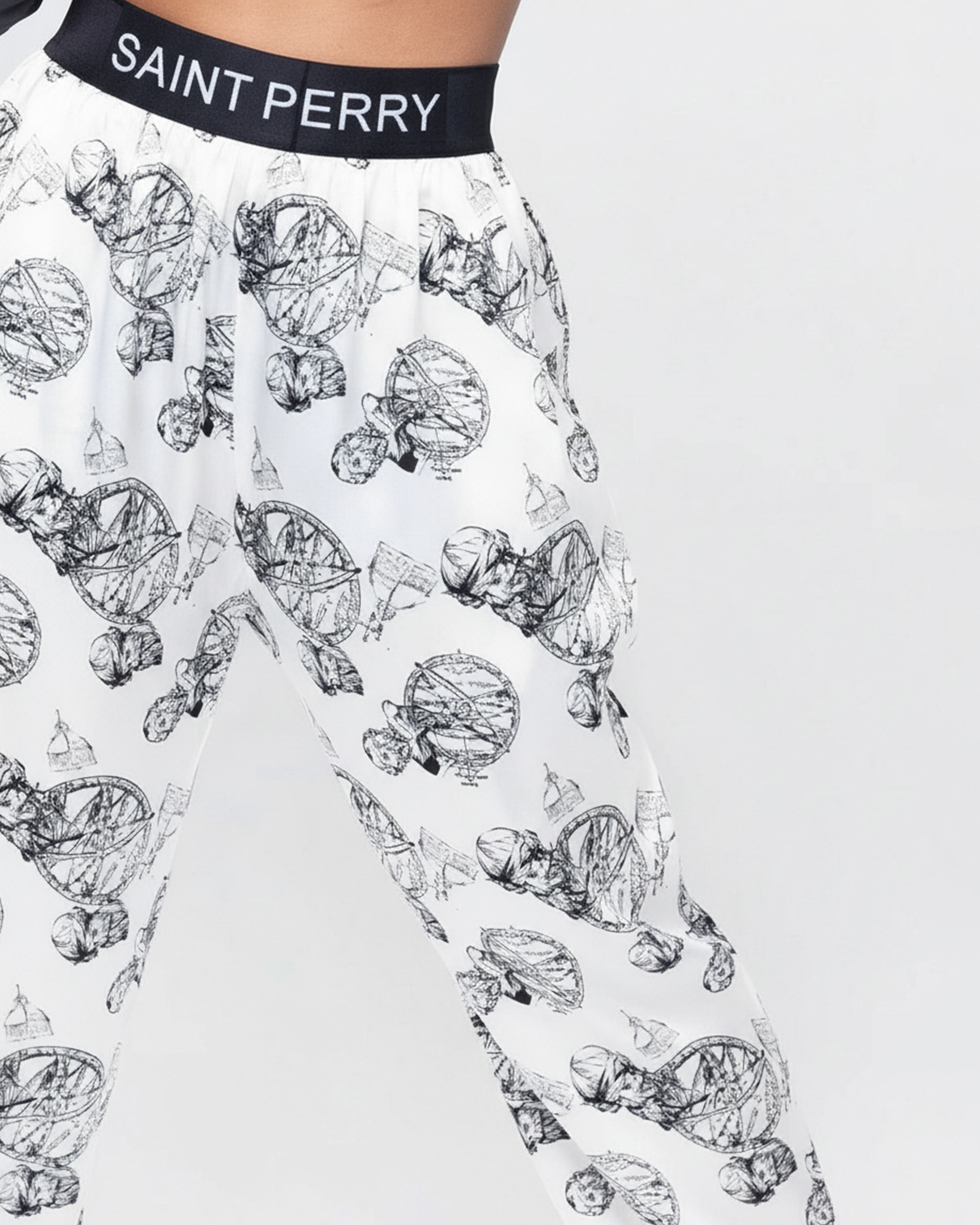 The design visualizes the structure of thought—diagrammatic spheres and lines printed in high contrast on a fluid canvas. This piece redefines luxury loungewear by merging the rigidity of technical drawings with the softness of 100% pure silk, offering an empowered silhouette for the modern woman.