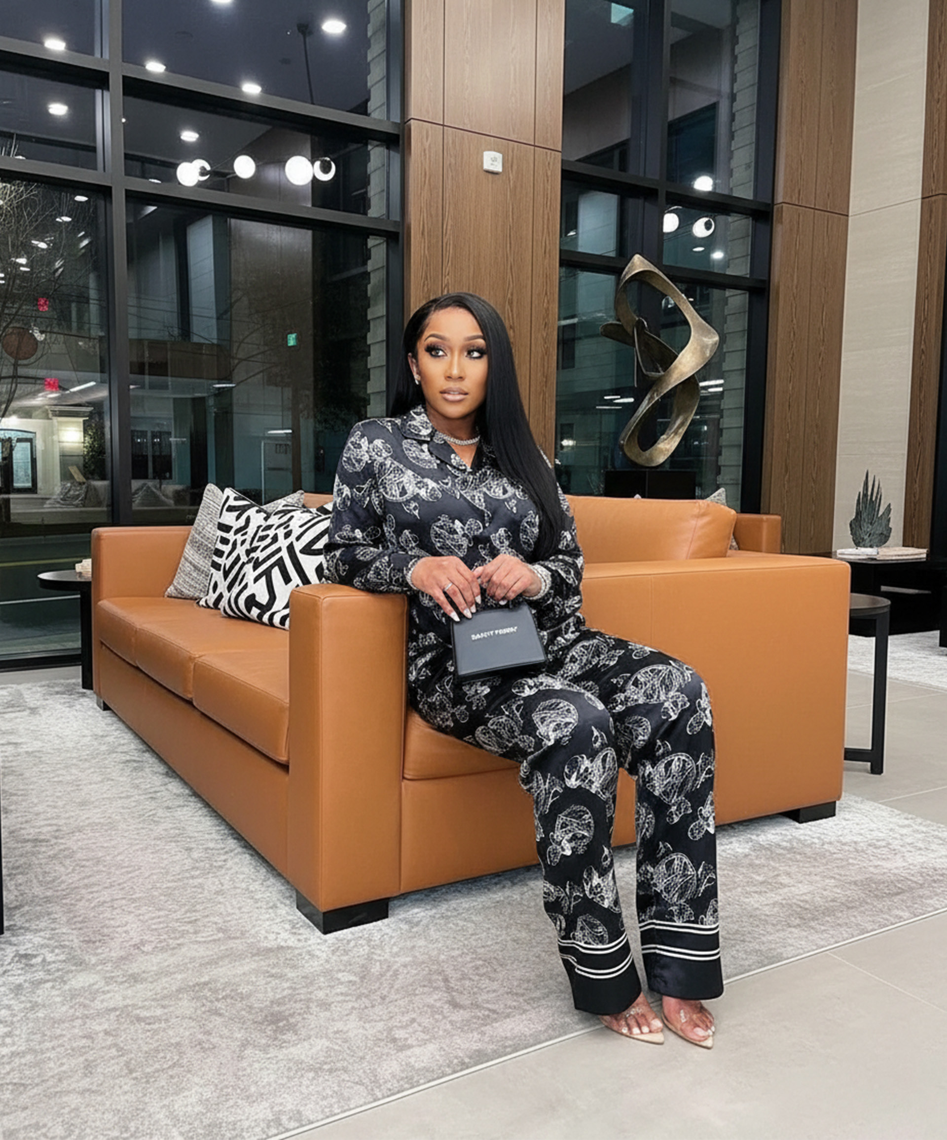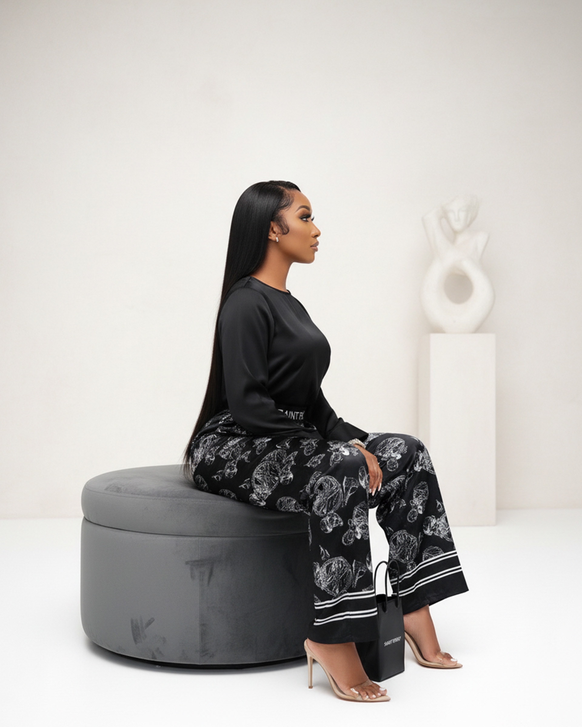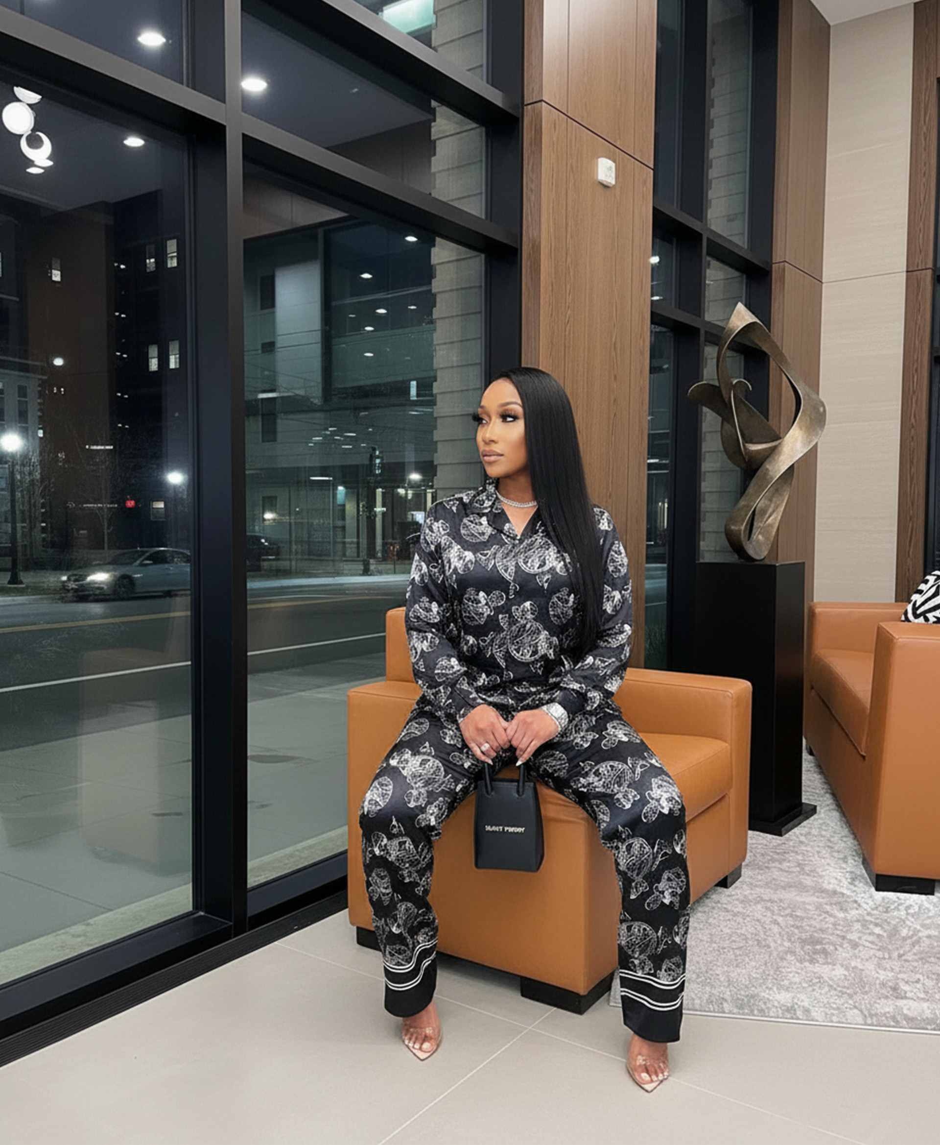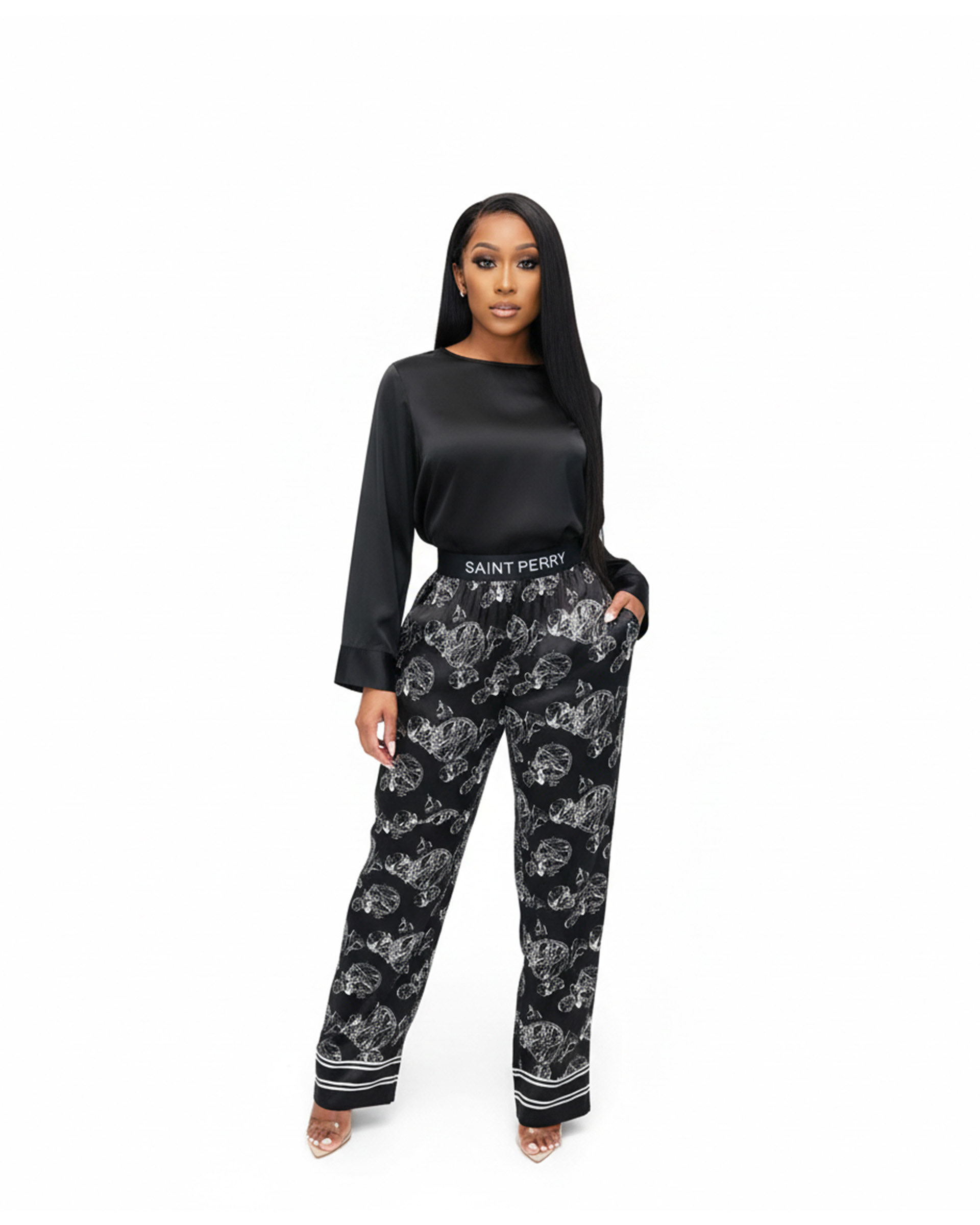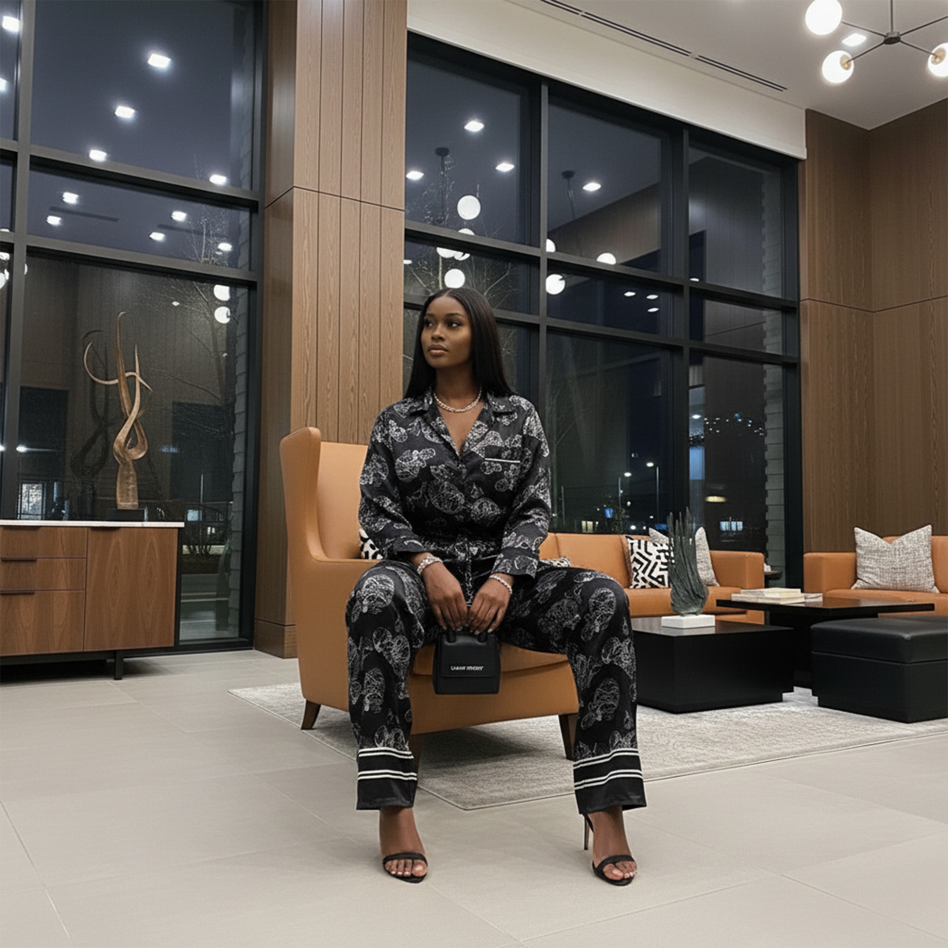 The design visualizes the structure of thought—diagrammatic spheres and lines printed in high contrast on a fluid canvas. This piece redefines luxury loungewear by merging the rigidity of technical drawings with the softness of 100% pure silk, offering an empowered silhouette for the modern woman.