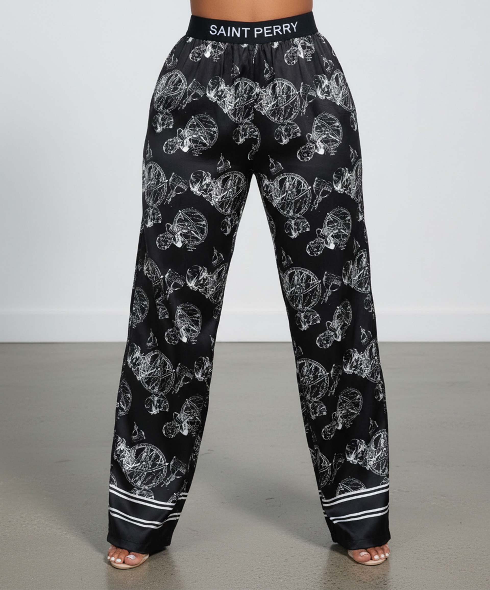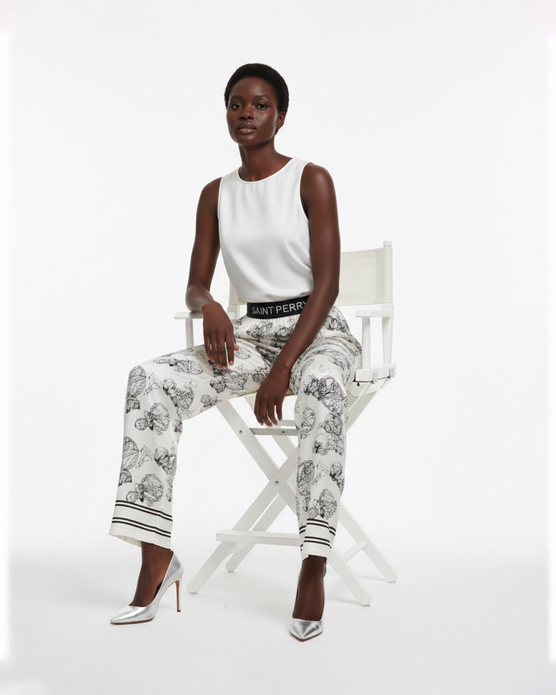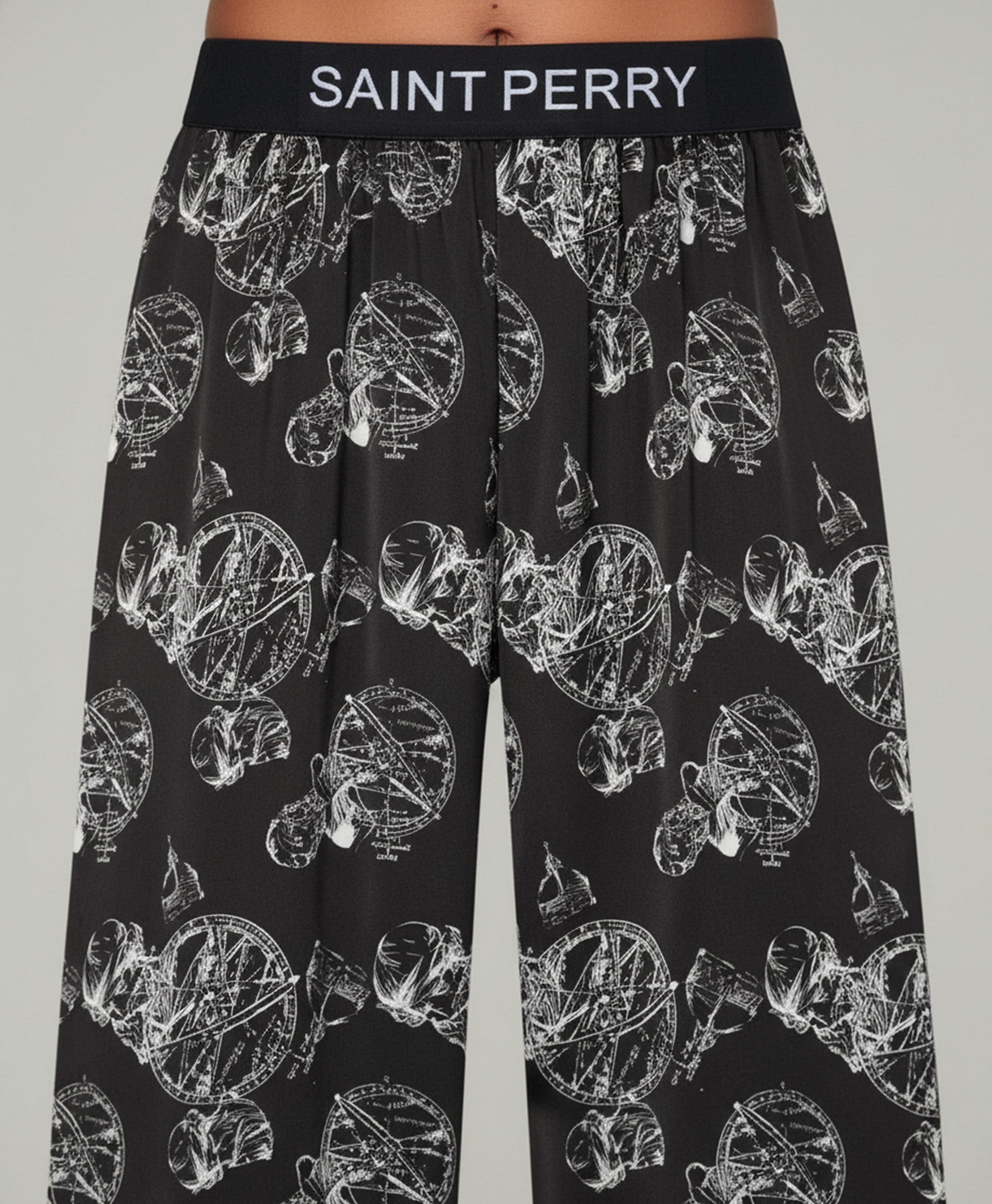 Concept Exploring the intersection of philosophy and feminine fluidity. The Plato Silk Trouser features a custom technical diagram print inspired by sacred geometry and architectural blueprints.