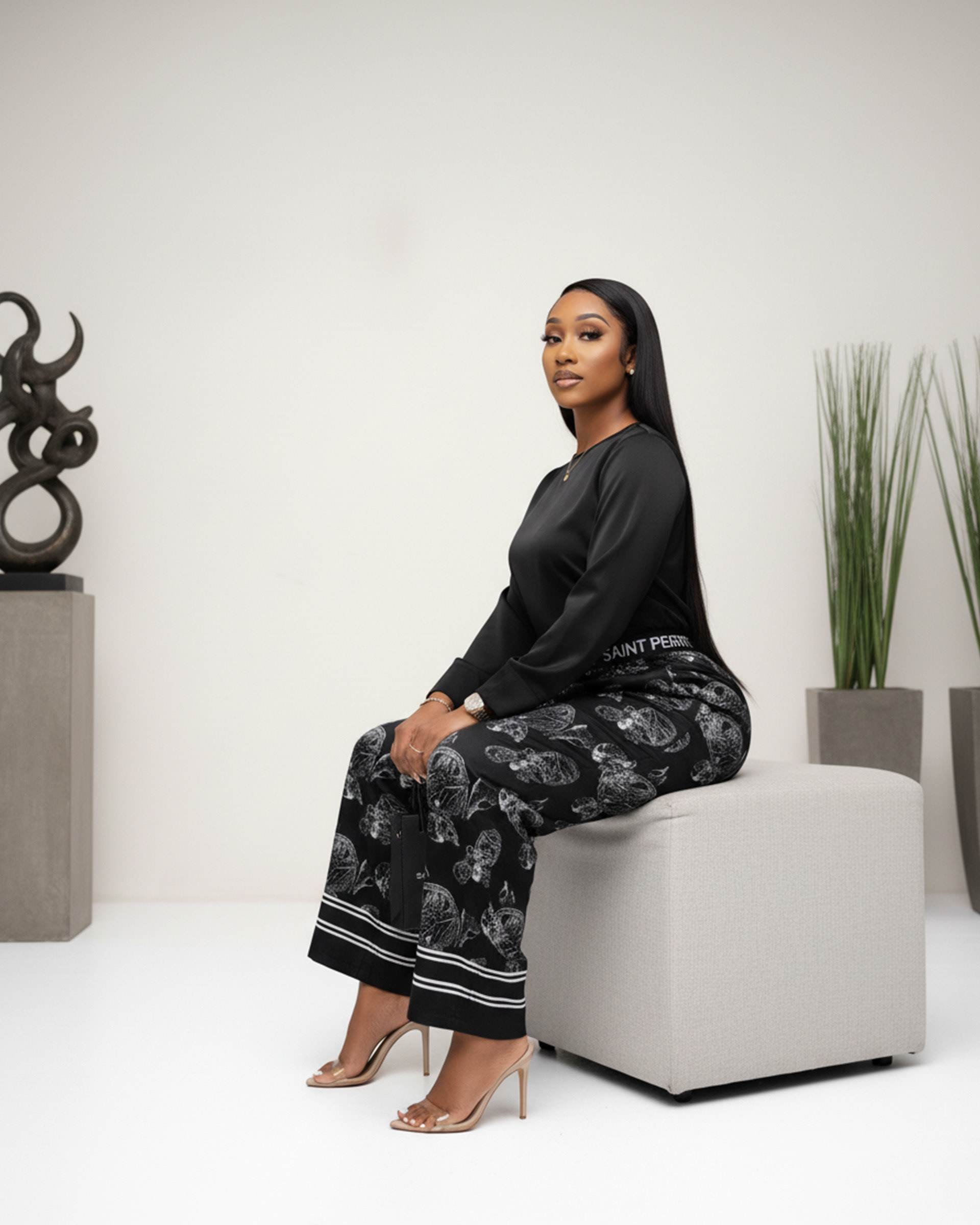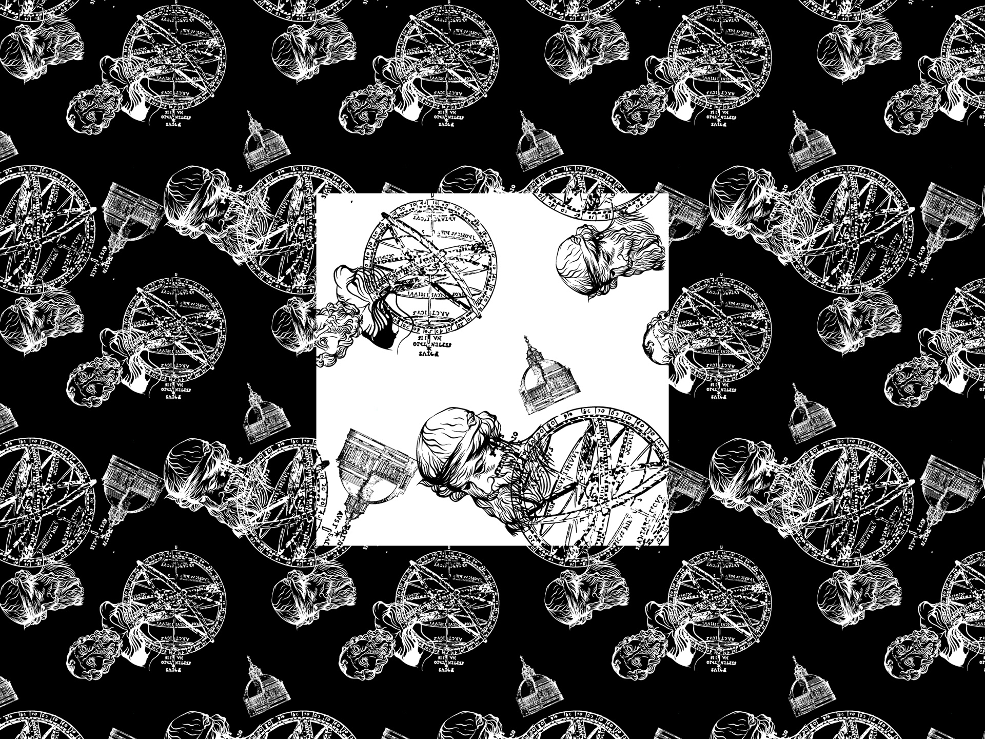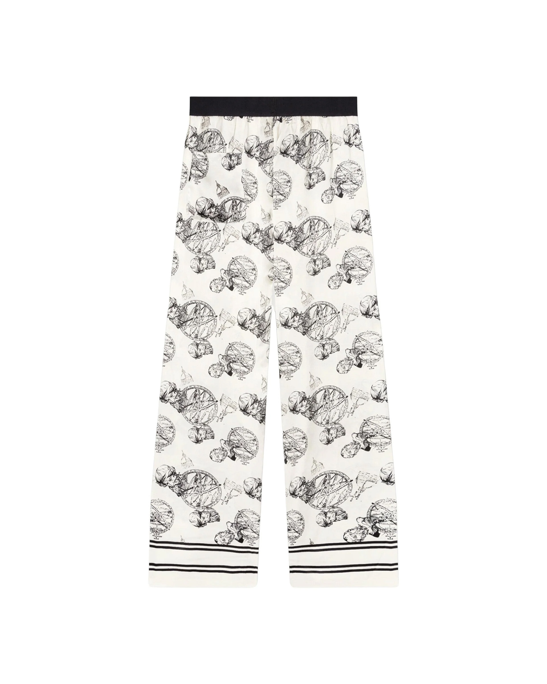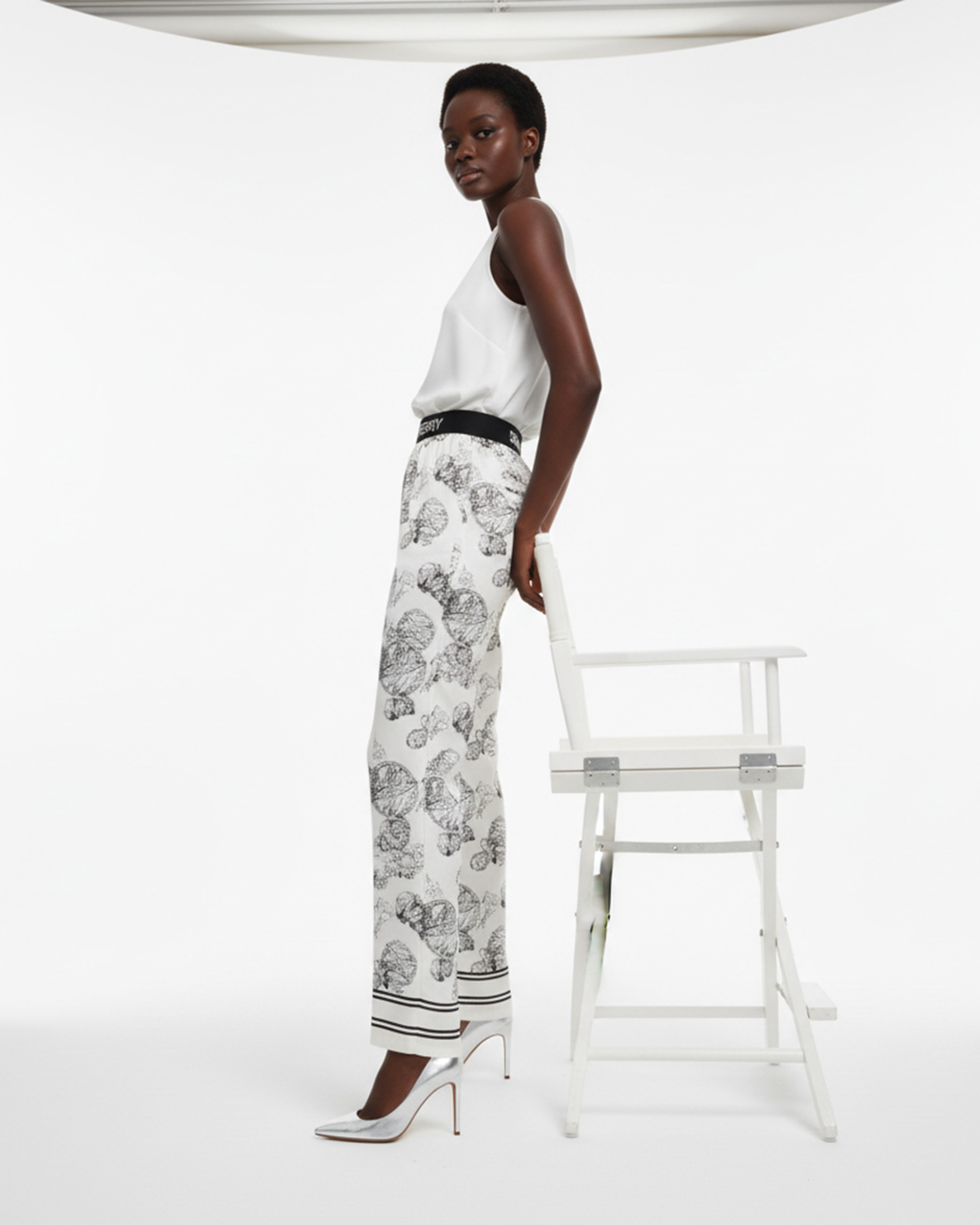 Concept Exploring the intersection of philosophy and feminine fluidity. The Plato Silk Trouser features a custom technical diagram print inspired by sacred geometry and architectural blueprints.