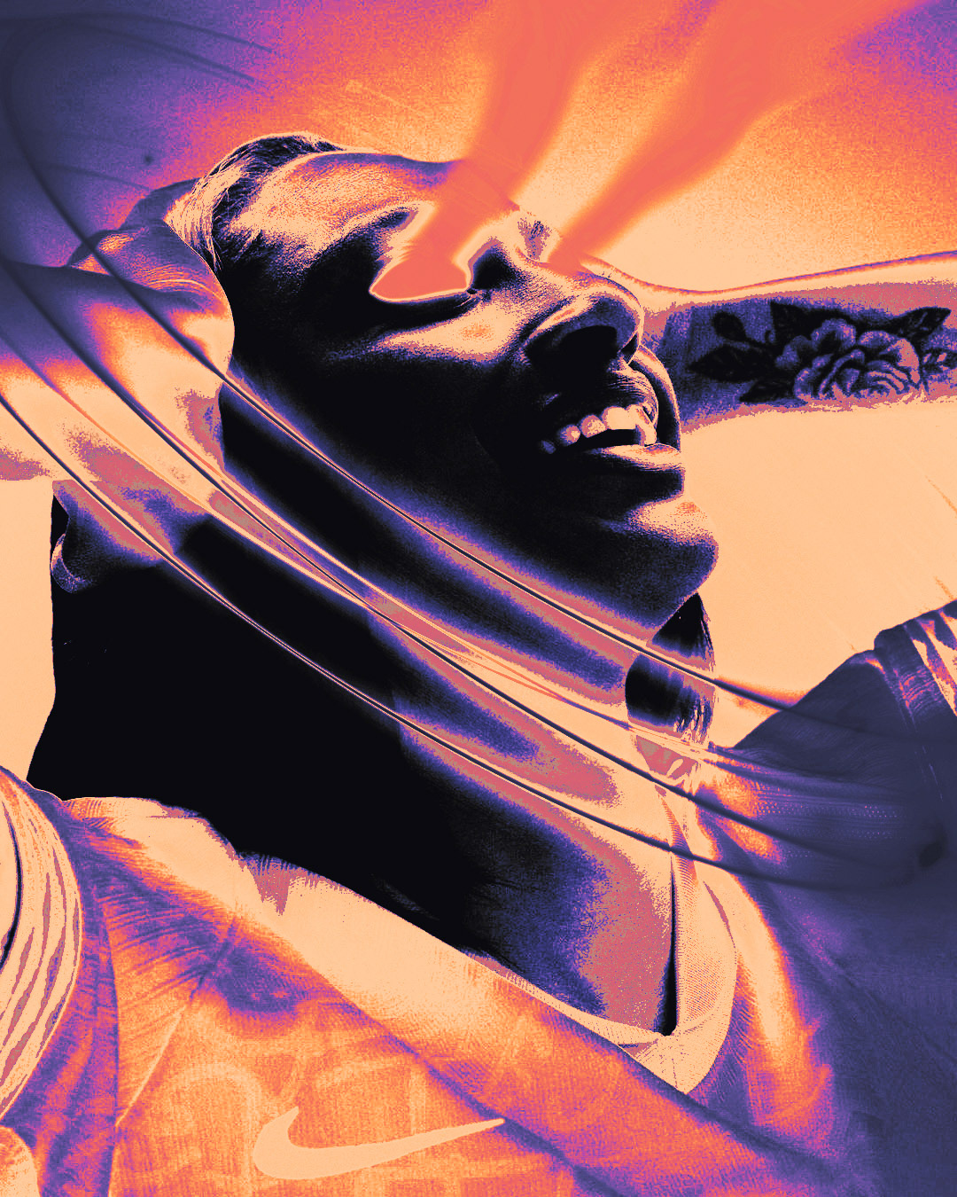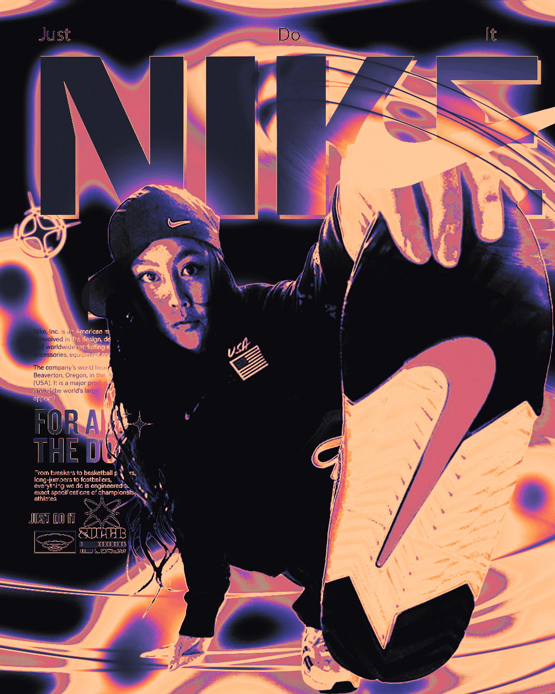 “Reimagined as a symbol of motion in chaos. The Nike swoosh evolves into a harsher, more fragmented emblem — representing energy, impact, and raw athleticism born from the streets.”