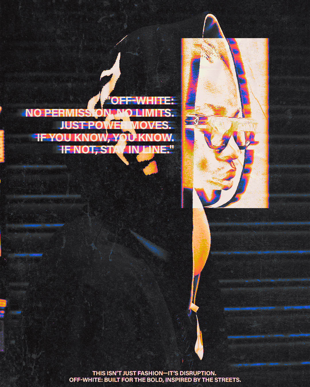 “The experimental soul of Off-White is reloaded with analog distortion. Stripped of polish, the design leans into controlled chaos — static, motion blur, and street-coded symbolism.”