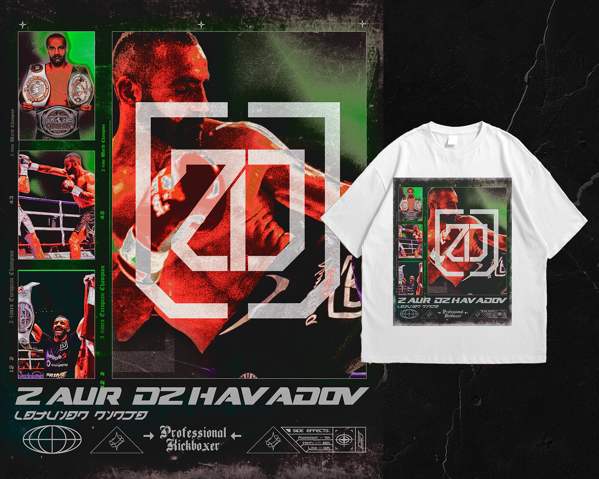 This collaborative project was created for professional Latvian kickboxer Zaur Dzhavadov — a 3-time World Champion and 3-time European Champion. I was entrusted to design bold, powerful, and personal merchandise graphics that truly reflect Zaur’s fighting spirit, discipline, and identity in the ring.